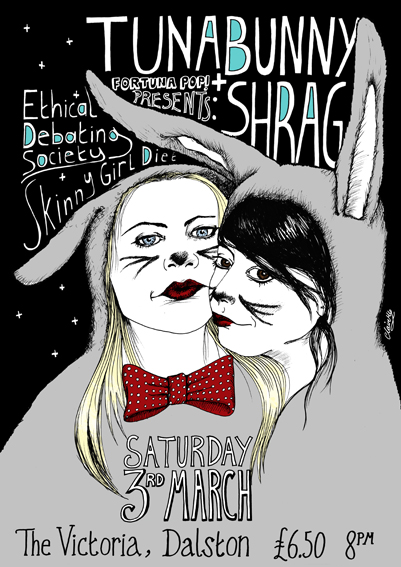 Claire has designed for Ace Bushy Striptease, Evans The Death, Fever Fever to name a few. She also created the end of tour party poster for Shrag (below), and her "Indiepop Ain't Noise Pollution" poster, inspired by Indietracks 2010 (above), is for sale on Etsy.
